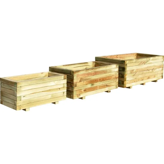 Dieses 3-teilige rechteckige Pflanzkübel-Set besteht aus den Größen 120x40x35 cm, 80x40x35 cm und 60x30x30 cm. Die Kübel werden aus FSC-zertifiziertem, chromfrei imprägniertem Kiefernholz gefertigt und sind sofort einsatzbereit. Dank der inkludierten Schutzfolie, der massiven Konstruktion und dem großzügigen Fassungsvermögen (120, 80 und 40 Liter) eignen sie sich perfekt für große Pflanzen, farbenfrohe Blumenarrangements oder Balkonbegrünung.